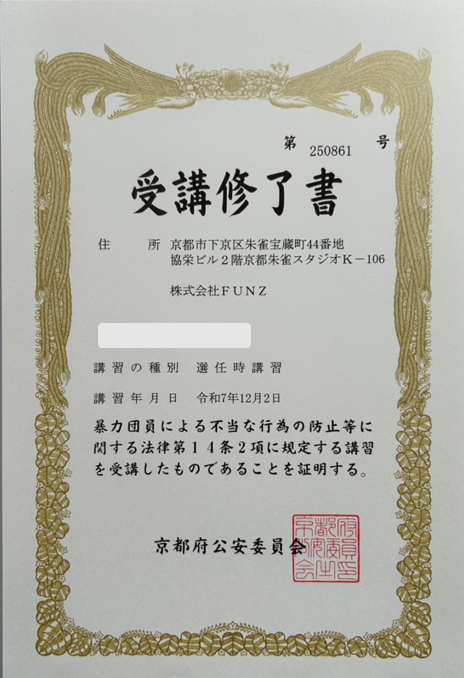 このたび、弊社は、公益財団法人京都府暴力追放運動推進センターが実施する「不当要求防止責任者講習」を無事修了し、正式に「不当要求防止責任者選任事務所」となりましたので、ご報告いたします。