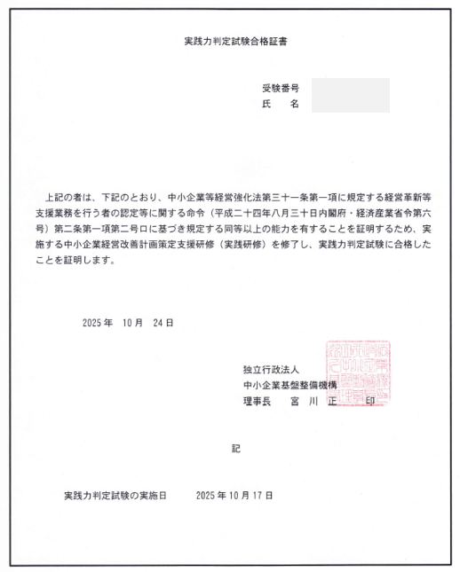 認定支援機関として実務レベルでの支援能力が一定水準に達していることを示すものです。
